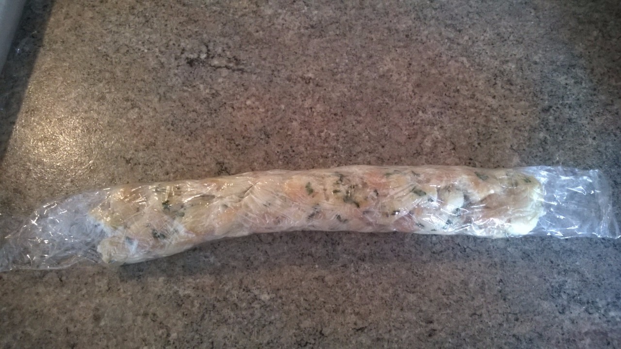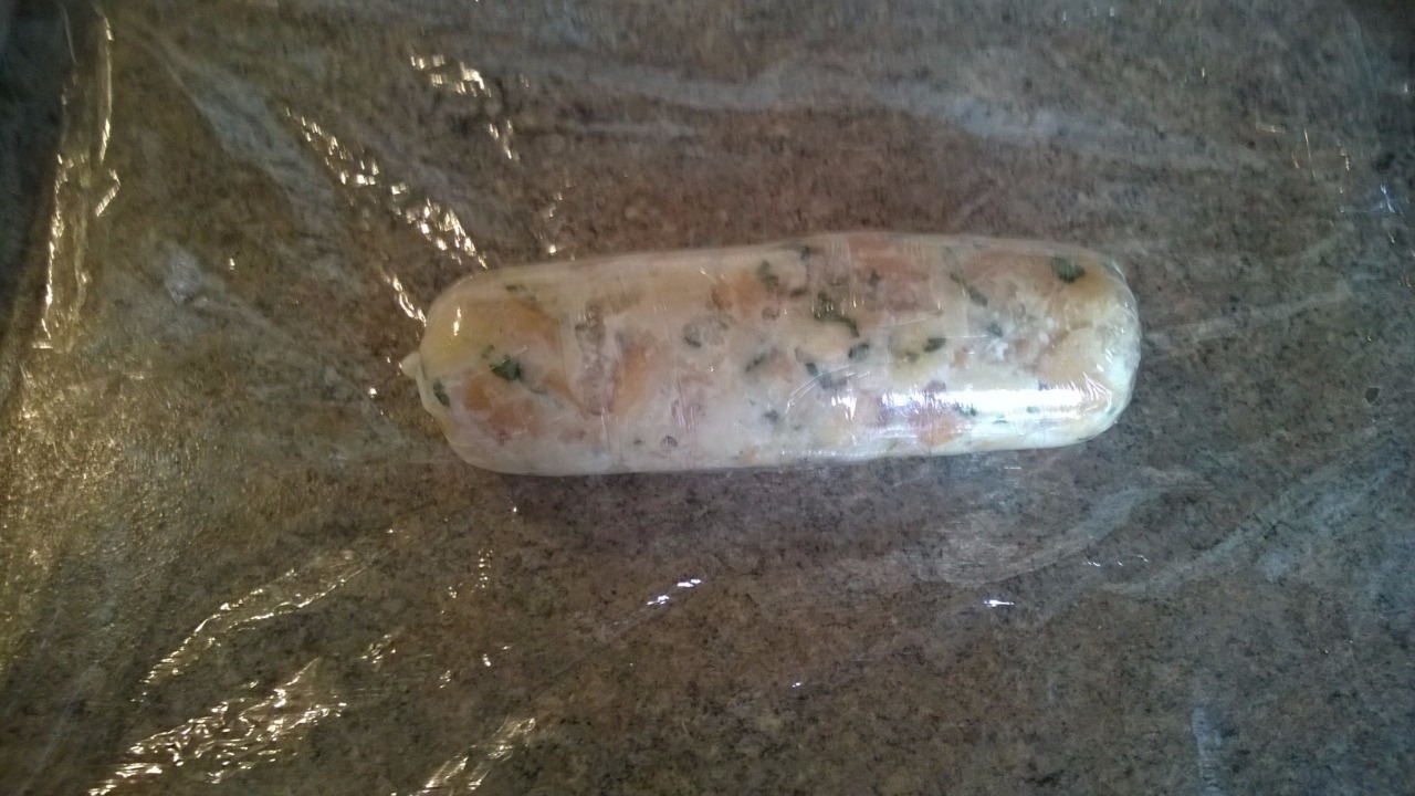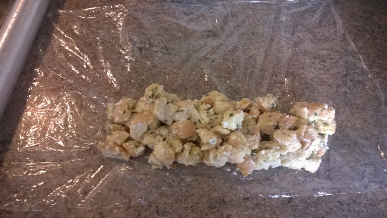 Rozprostřete si před sebe kus potravinářské folie a na kraj, který je vám nejblíže navrstvěte cca polovinu směsi. Musí vám zůstat po obou stranách volný kus folie.